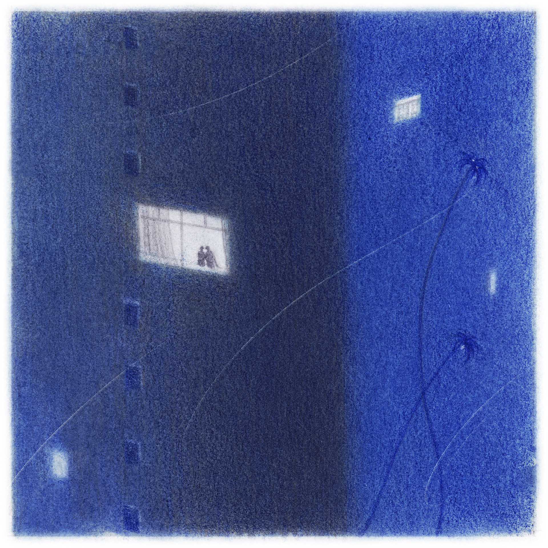 Through the window, two distant figures exchange glances, as if words hover on their lips yet cannot find their way out.